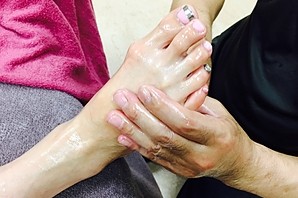 ホットタオルで足を拭いてから、アロエクリーム・コラーゲンクリーム・抹茶ローションを使い分けて施術をいたします。